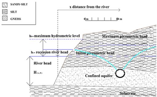 This paper deals with the efficacy of horizontal drainage on the attenuation of a continuous series of rising and lowering of the groundwater head of the rivers. The repetition of these events can indeed produce underground erosion and subsidence of the soil. The horizontal drains arrangement is parallel to river, and the effectiveness of the drainage depends over all by their distance and by their depth respect to watercourse.